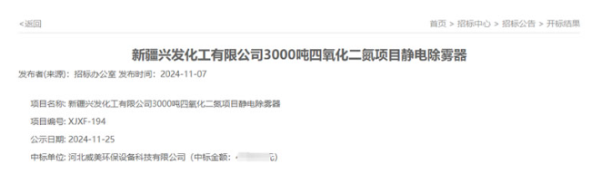 威美環(huán)保中標(biāo)新疆興發(fā)3000噸四氧化二氮項(xiàng)目靜電除霧器