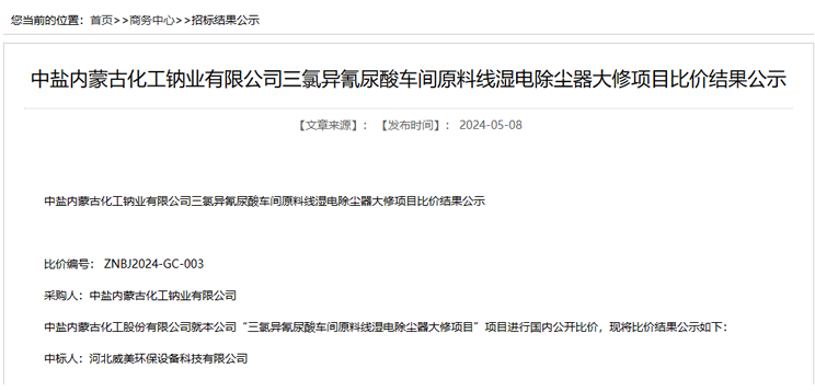 河北威美中標(biāo)中鹽內(nèi)蒙古三氯異氰尿酸車(chē)間濕電除霧器大修項(xiàng)目,以下是比價(jià)結(jié)果公告