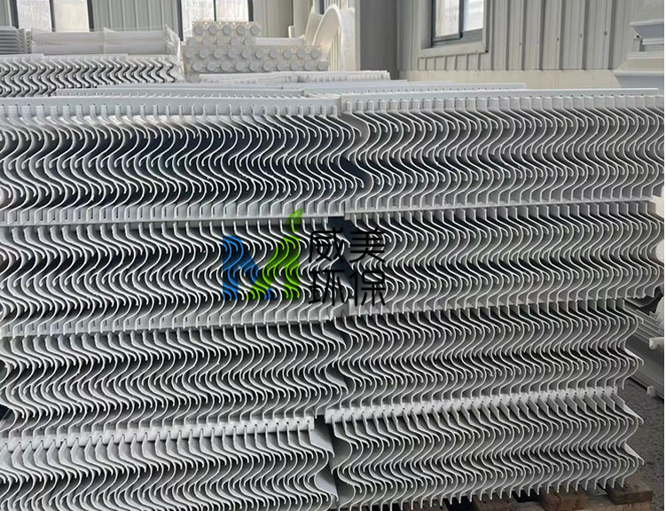 平板式除霧器適用于中、低氣速的吸收塔,主要用于氣體和流體的分離,一般被裝在吸收塔的頂部,可以很好去除3-5μm的霧滴,其分離出來的液滴直接落入吸收塔內的漿液池中。根據(jù)性能要求,平板式除霧器可以用于一層或者多層系統(tǒng),并且可以加裝在線沖洗系統(tǒng),另外平板式除霧器也可以配合濕電靜電除霧器、管束除塵除霧器等設備使用。