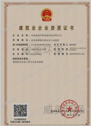 建筑業(yè)的企業(yè)資質(zhì)證書是企業(yè)資產(chǎn),是對(duì)威美人才力量與作業(yè)能力的肯定。河北威美環(huán)保設(shè)備是一家集設(shè)計(jì)、制造、安裝、調(diào)試濕電除霧器、脫硫設(shè)備于一體的高新型技術(shù)企業(yè)。河北威美環(huán)保堅(jiān)持在尾氣治理設(shè)備制造領(lǐng)域中不斷創(chuàng)新發(fā)展,目前已有百余臺(tái)設(shè)備運(yùn)行在燃煤鍋爐、金屬冶煉、氰尿酸、磷化工、生物質(zhì)(糖廠/糠醛)鍋爐、高性能纖維、垃圾焚燒等領(lǐng)域。我們通過電話溝通,實(shí)地考察測(cè)量,為您的生產(chǎn)線量身定制尾氣治理方案。威美環(huán)保將持續(xù)深耕于煙氣治理設(shè)備制造領(lǐng)域,進(jìn)一步加大技術(shù)的開發(fā)和創(chuàng)新力度,并不斷增強(qiáng)自身的核心競(jìng)爭(zhēng)力,推動(dòng)高質(zhì)量的發(fā)展。